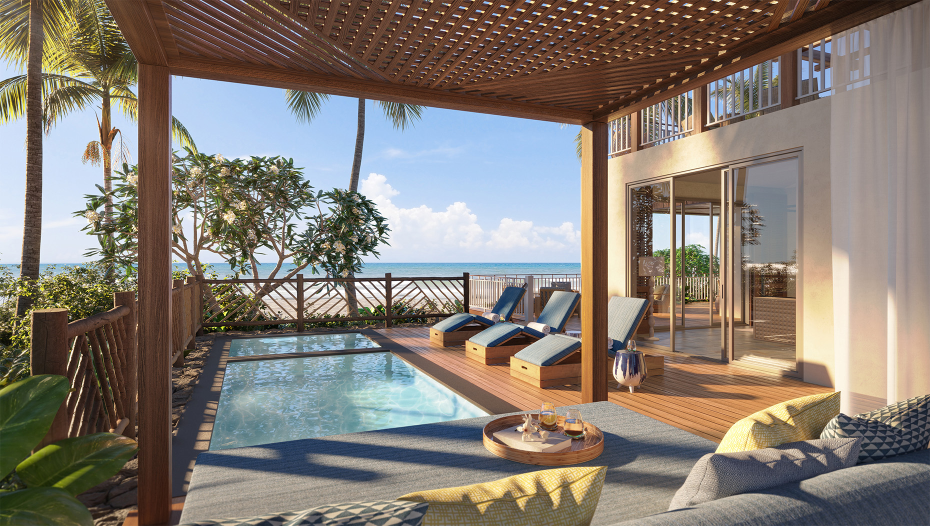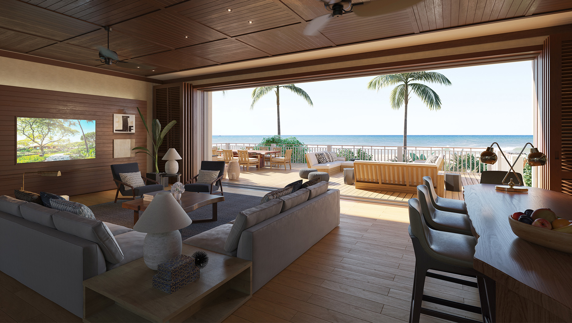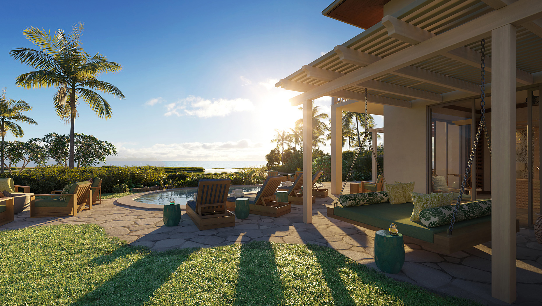 The casual beauty of a Hawaiian beach house with generous living, dining and gathering space, and three to five bedrooms for luxurious seclusion. Walls of windows open on the infinite panorama and invite the fresh breezes of the tradewinds indoors. A new second-level master bedroom and open living space elevate perspectives for all. A private pool and spa await in the expanded great lawn, a perfect stage for significant moments from formal weddings to romantic picnics to family croquet.